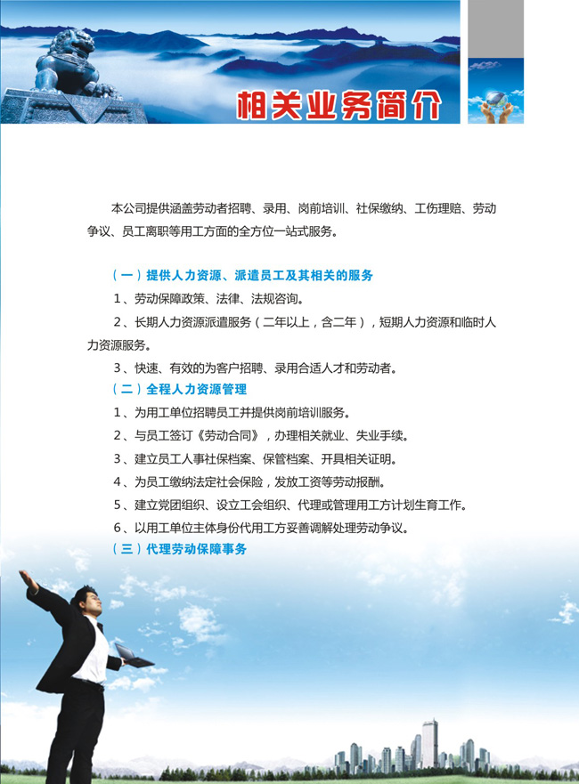 本公司提供涵蓋勞動者招聘、錄用、崗前培訓、社保繳納、工傷理賠、勞動爭議、員工離職等用工方面的全方位一站式服務(wù)。